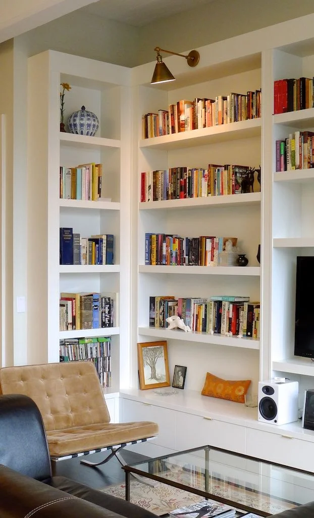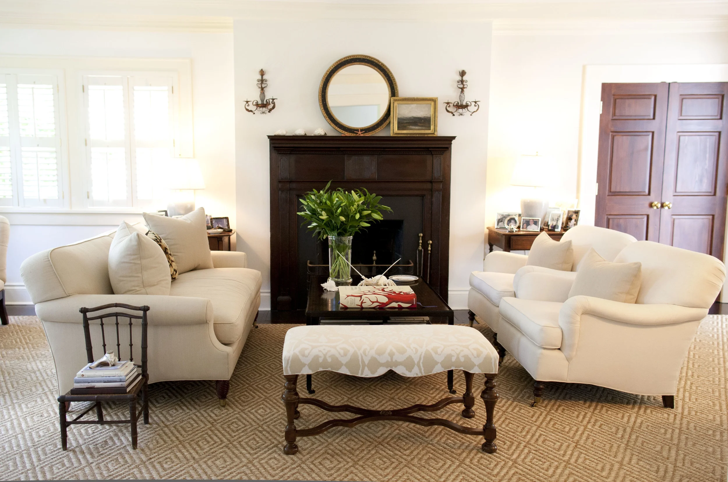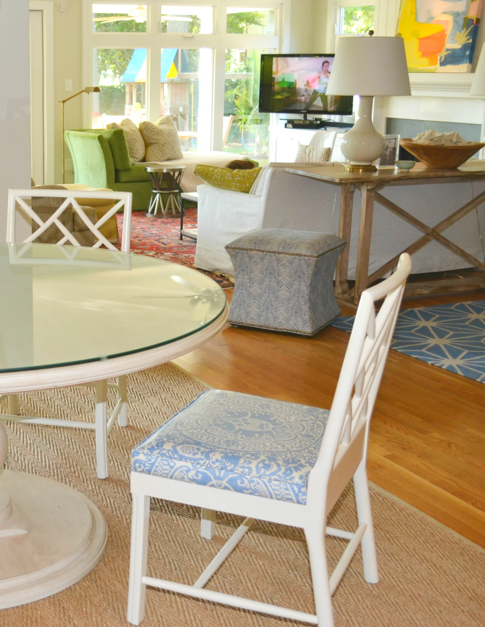 OUR CHALLENGE? THIS ROOM IS LONG AND SKINNY AND THE RADIATOR AGAINST THE WALL INFRINGED ON OUR ROOM DEPTH.THE SOLUTION? IM THINKING LOTS OF UPHOLSTERY WILL OPEN UP THE SPACE. SOMETIMES SMALLER QUIRKY AREAS NEED BIG FURNITURE! A NICE LONG SECTIONAL AGAINST THE RADIATOR WORKS PERFECTLY! TWO SWIVEL CHAIRS HELP WIDEN THE ROOM AND PROVIDE EXTRA SEATING FOR TV WATCHING. WE ALSO ADDED TWO SMALL ROUND OTTOMANS FOR COLOR, FUNCTION AND BALANCE....FINALLY, A LARGE SCALE COFFEE TABLE TRICKS YOU INTO THINKING THE ROOM IS BIGGER THAN IT REALLY IS! HERE'S THE PLAN: