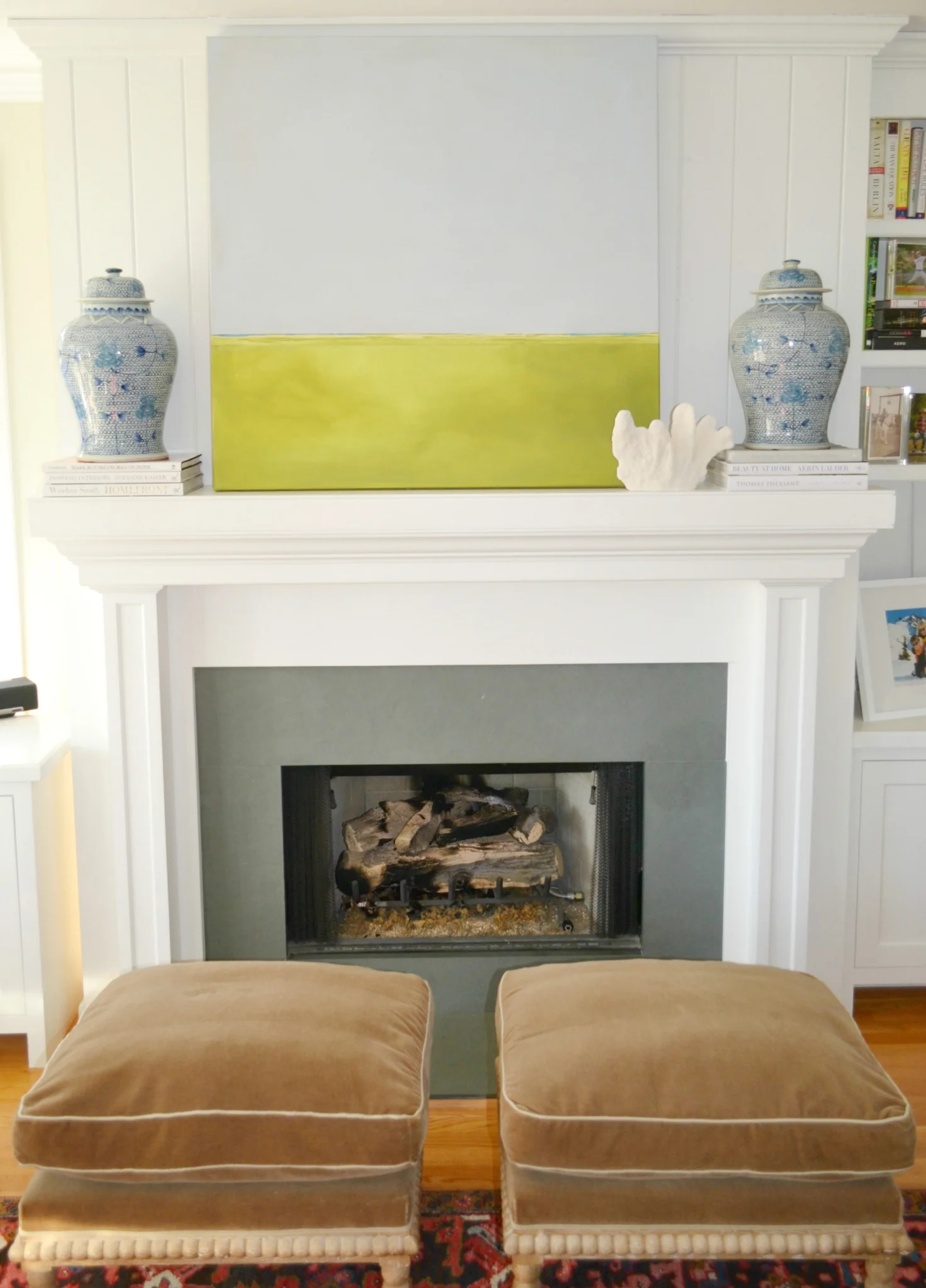 FIRST WAY: so i decided to purchase these blue and white ginger jars that i have been staring at online for years.....great anchor for paintings and great way to chunk up the focal point of the room (being the fireplace!) next, I've been wanting to paint an abstract marsh scene...one of the my most beautiful memories from my charleston, sc days are the marshes in the early spring at Sullivan's Island. the marshes are FLORESCENT green and absolutely stunning-perfect subject matter for my spring mantle! then i stacked books to give the jars more height to help balance the weight of the painting....i threw in piece of white coral and we have a spring mantle!