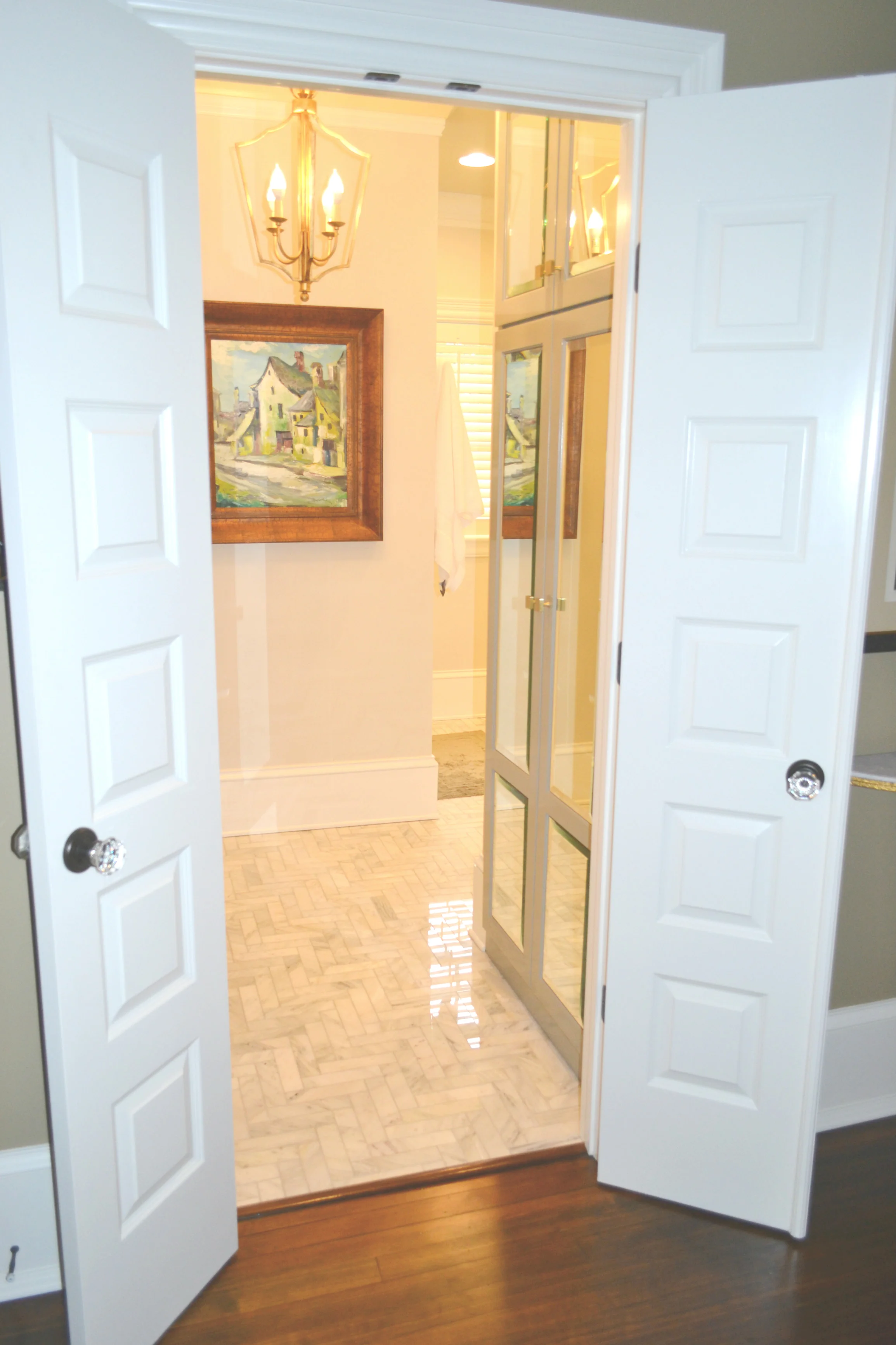 BEFORE, THIS MASTER BATH WAS DATED, HAD AN AWKWARD LAYOUT, AND WAS EXPOSED TO THE MASTER BEDROOM. WE NEEDED TO CREATE A MORE ATTRACTIVE TRANSITION FROM THE BEDROOM TO THE BATH THAT MORE OFFERED PRIVACY. WE ALSO NEEDED AN EFFICIENT USE OF SPACE INCLUDING A WATER CLOSET, DOUBLE VANITY, LINEN CLOSET, AND WALK IN CLOSET. HERE'S THE BEFORE: