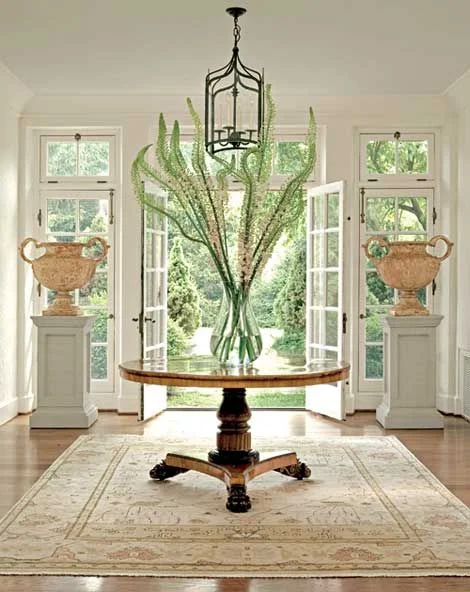 WITH THE HIGH CEILING AND EXPANSIVE SIZE OF THE FOYER, WE NEEDED TO WARM UP THE SPACE-SO WE FOCUSED ON THE FIRST WALL YOU SEE WHEN YOU WALK IN THE DOOR TO MAKE A GREAT FIRST IMPRESSION.....AND THIS WALL WAS WORTHY OF WAY MORE STUFF!!! WE STARTED WITH A LARGE GRASSCLOTH CONSOLE THAT STRETCHED ACROSS THE ENTIRE WALL......SEE BELOW!